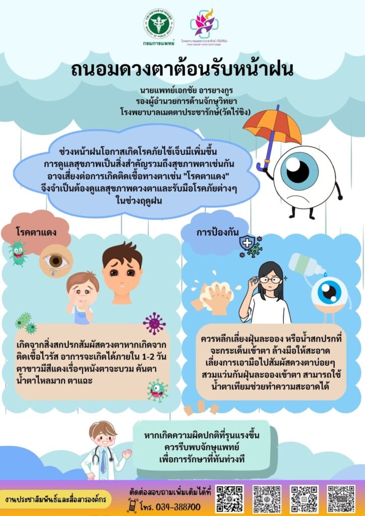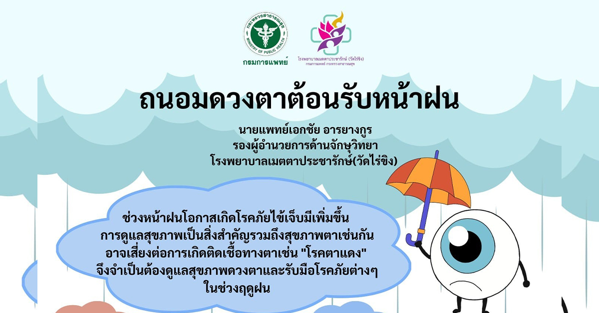 นายแพทย์อาคม ชัยวีระวัฒนะ ผู้อำนวยการโรงพยาบาลเมตตาประชารักษ์ (วัดไร่ขิง) กล่าวเพิ่มเติมว่า ในช่วงหน้าฝนที่มีสภาพอากาศอับชื้นและเย็นลง ซึ่งเหมาะแก่การเจริญเติบโตของเชื้อโรค หากเป็นผู้ที่มีภูมิต้านทานไม่แข็งแรง เข้าหน้าฝนอาการเจ็บไข้ได้ป่วยก็มาเยือน ไม่เพียงแต่เสี่ยงกับโรคระบบทางเดินหายใจ หรือ โรคทางผิวหนังแล้ว ดวงตาก็มีความเสี่ยงเช่นกัน โดยเฉพาะ “โรคตาแดง” ระบาดได้บ่อย เมื่อเข้าสู่ฤดูกาลหน้าฝนโรคตาแดง มักระบาดในหน้าฝน เพราะเมื่อฝนตก น้ำฝนจะไปชะล้างฝุ่นละอองที่อยู่ตามอาคาร หลังคา ตามรั้วต่างๆ และอาจกระเด็นมาสู่ตาเราได้ ซึ่งน้ำที่ท่วมขังก็อาจจะมีเชื้อไวรัส หรือแบคทีเรีย เมื่อน้ำที่สกปรกนั้นกระเด็นเข้าตาเรา ก็จะเกิดการติดเชื้อไปอย่างรวดเร็ว อาการรุนแรงที่สุดจะมีอาการอักเสบ เคืองตาอย่างรุนแรง ตามัว หากมีปัญหากับดวงตาหรือมีอาการผิดปกติควรพบจักษุแพทย์