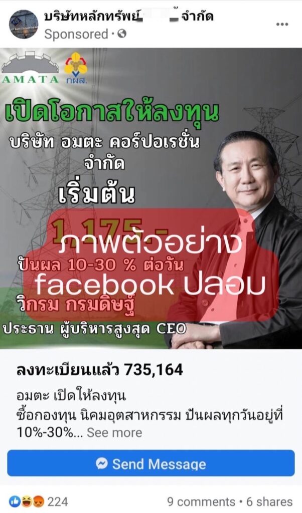 กรมสอบสวนคดีพิเศษ โดยกองคดีธุรกิจการเงินนอกระบบ ได้รับแจ้งเบาะแสว่ามีการปลอม Facebook ด้วยการใช้ชื่อบริษัท อมตะ คอร์เปอเรชั่น จำกัด (มหาชน) ซึ่งตั้งอยู่ในพื้นที่จังหวัดชลบุรี มีพฤติการณ์หลอกลวงให้ประชาชนทั่วไปร่วมลงทุนกับบริษัทผ่านกองทุนต่างๆ ในการขยายกิจการและดำเนินธุรกิจของบริษัท โดยเสนอให้ผลตอบแทนสูงกว่าที่กฎหมายกำหนด มีการหลอกลวงให้ลงทุนหลายรูปแบบ เช่น ประเภท Day Trade เป็นการเปิดพอร์ตการลงทุน และลงทุนขั้นต่ำเป็นจำนวนเงิน 1,000 บาท จะได้รับผลตอบแทนร้อยละ 12-30 ของเงินที่ได้ลงทุนไป หรือประเภทปันผลระยะยาว โดยต้องเปิดพอร์ตการลงทุน และลงทุนขั้นต่ำ 20,000 บาท เป็นต้น รวมถึงรูปแบบจ่ายผลตอบแทนแบบอื่นๆ เช่น เสนอผลตอบแทน 10-30% ต่อเดือน อันเป็นอัตราดอกเบี้ยที่สูง