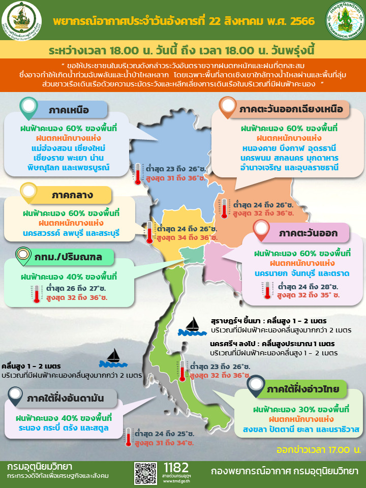 กรมอุตุนิยมวิทยาพยากรณ์อากาศ 24 ชั่วโมงข้างหน้า ร่องมรสุมพาดผ่านตอนบนของภาคเหนือ และประเทศลาวตอนบน เข้าสู่หย่อมความกดอากาศต่ำบริเวณประเทศเวียดนามตอนบน ในขณะที่มรสุมตะวันตกเฉียงใต้กำลังปานกลางยังคงพัดปกคลุมทะเลอันดามัน ประเทศไทย และอ่าวไทย ลักษณะเช่นนี้ทำให้ประเทศไทยยังคงมีฝนฟ้าคะนองเกิดขึ้นได้ และมีฝนตกหนักบางแห่งในภาคเหนือ ภาคตะวันออกเฉียงเหนือ ภาคกลาง ภาคตะวันออก และภาคใต้ ขอให้ประชาชนในบริเวณดังกล่าวระวังอันตรายจากฝนตกหนักและฝนที่ตกสะสม ซึ่งอาจทำให้เกิดน้ำท่วมฉับพลันและน้ำป่าไหลหลาก โดยเฉพาะพื้นที่ลาดเชิงเขาใกล้ทางน้ำไหลผ่านและพื้นที่ลุ่ม สำหรับคลื่นลมบริเวณทะเลอันดามันและอ่าวไทยมีกำลังปานกลาง โดยมีคลื่นสูงประมาณ 1 เมตร บริเวณที่มีฝนฟ้าคะนองคลื่นสูง 1-2 เมตร ขอให้ชาวเรือในบริเวณดังกล่าวเดินเรือด้วยความระมัดระวังและหลีกเลี่ยงการเดินเรือในบริเวณที่มีฝนฟ้าคะนองไว้ด้วย