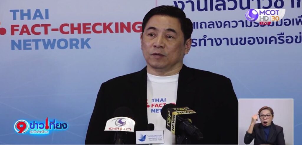 นายผาติยุทธ ใจสว่าง รักษาการในตำแหน่งผู้อำนวยการใหญ่ บมจ.อสมท ร่วมงานเสวนาวิชาการและแถลงความร่วมมือเพื่อบูรณาการและเสริมพลังการทำงานของเครือข่ายตรวจสอบข้อเท็จจริง (Thai Fact – Checking Network) พร้อมด้วยงานเสวนา “สถานการณ์ข่าวลวงในปัจจุบันและความสำคัญของการตรวจสอบข้อเท็จจริงของสื่อมวลชน” จัดโดยกองทุนพัฒนาสื่อปลอดภัยและสร้างสรรค์ โดยมี ดร.ธนกร ศรีสุขใส ผู้จัดการกองทุนพัฒนาสื่อปลอดภัยและสร้างสรรค์ เป็นประธาน