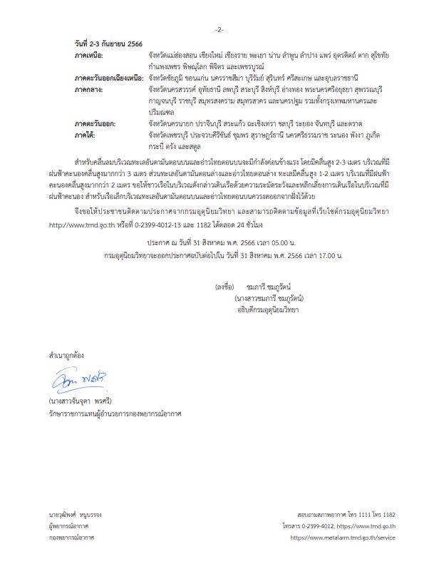 อนึ่ง พายุไต้ฝุ่น “เซาลา” (SAOLA) บริเวณทะเลจีนใต้ตอนบน คาดว่าจะเคลื่อนเข้าใกล้ชายฝั่งประเทศจีนตอนใต้ ในช่วงวันที่ 1-3 กันยายน 2566 โดยพายุนี้ไม่ส่งผลกระทบต่อลักษณะอากาศของประเทศไทยโดยตรง ขอให้ผู้ที่จะเดินทางไปยังบริเวณดังกล่าวตรวจสอบสภาพอากาศก่อนออกเดินทางในช่วงวันและเวลาดังกล่าว