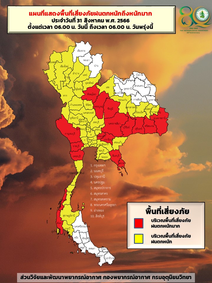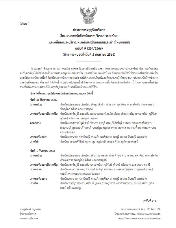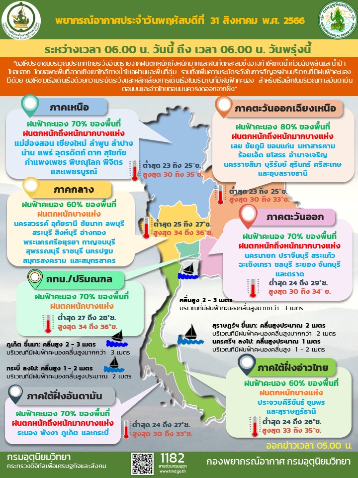 กรมอุตุนิยมวิทยา พยากรณ์อากาศ 24 ชั่วโมงข้างหน้า ร่องมรสุมกำลังแรงพาดผ่านภาคเหนือ ภาคตะวันออกเฉียงเหนือ ประกอบกับมรสุมตะวันตกเฉียงใต้กำลังค่อนข้างแรงพัดปกคลุมทะเลอันดามัน ประเทศไทย และอ่าวไทย ลักษณะเช่นนี้ทำให้ประเทศไทยมีฝนตกหนักบางแห่งในภาคกลางและภาคใต้ โดยมีฝนตกหนักมากบางแห่งในภาคเหนือ ภาคตะวันออกเฉียงเหนือ และภาคตะวันออก ขอให้ประชาชนในบริเวณดังกล่าวระวังอันตรายจากฝนตกหนักถึงหนักมากและฝนที่ตกสะสม ซึ่งอาจทำให้เกิดน้ำท่วมฉับพลันและน้ำป่าไหลหลาก โดยเฉพาะพื้นที่ลาดเชิงเขาใกล้ทางน้ำไหลผ่านและพื้นที่ลุ่ม รวมทั้งเพิ่มความระมัดระวังในการสัญจรผ่านบริเวณที่มีฝนฟ้าคะนอง