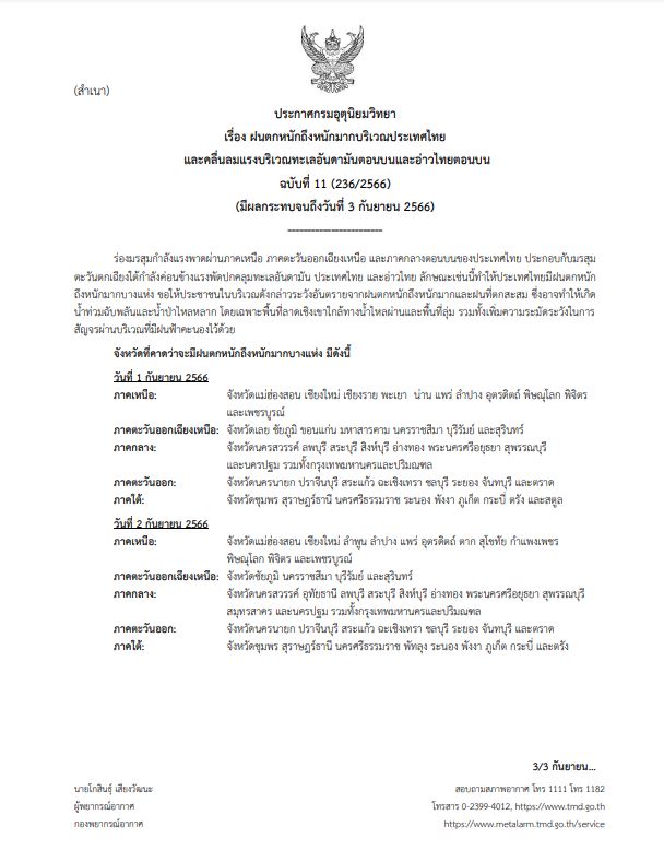 กรมอุตุนิยมวิทยา พยากรณ์อากาศ 24 ชั่วโมงข้างหน้า ร่องมรสุมกำลังแรงพาดผ่านภาคเหนือ ภาคกลาง และภาคตะวันออกเฉียงเหนือตอนล่างของประเทศไทย ประกอบกับมรสุมตะวันตกเฉียงใต้กำลังค่อนข้างแรงพัดปกคลุมทะเลอันดามัน ประเทศไทย และอ่าวไทย ลักษณะเช่นนี้ทำให้ประเทศไทยมีฝนตกหนักบางแห่งในภาคเหนือ ภาคตะวันออกเฉียงเหนือ ภาคกลาง รวมทั้งกรุงเทพมหานครและปริมณฑล และภาคใต้ฝั่งตะวันออก โดยมีฝนตกหนักมากบางแห่งในภาคตะวันออก และภาคใต้ฝั่งตะวันตก ขอให้ประชาชนในบริเวณดังกล่าวระวังอันตรายจากฝนตกหนักถึงหนักมากและฝนที่ตกสะสม ซึ่งอาจทำให้เกิดน้ำท่วมฉับพลันและน้ำป่าไหลหลาก โดยเฉพาะพื้นที่ลาดเชิงเขาใกล้ทางน้ำไหลผ่านและพื้นที่ลุ่ม รวมทั้งเพิ่มความระมัดระวังในการสัญจรผ่านบริเวณที่มีฝนฟ้าคะนอง