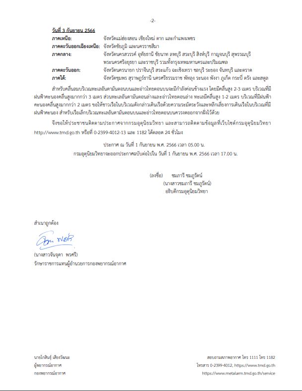 อนึ่ง พายุไต้ฝุ่น “เซาลา” (SAOLA) บริเวณทะเลจีนใต้ตอนบน คาดว่าจะเคลื่อนเข้าใกล้เขตบริหารพิเศษฮ่องกง ประเทศจีน ในวันนี้ (1 ก.ย.66) หลังจากนั้นจะเคลื่อนตามแนวชายฝั่งประเทศจีนตอนใต้ ในช่วงวันที่ 2-4 กันยายน 2566 โดยพายุนี้ไม่ส่งผลกระทบต่อลักษณะอากาศของประเทศไทยโดยตรง ขอให้ผู้ที่จะเดินทางไปยังบริเวณดังกล่าวตรวจสอบสภาพอากาศก่อนออกเดินทางในช่วงวันและเวลาดังกล่าว