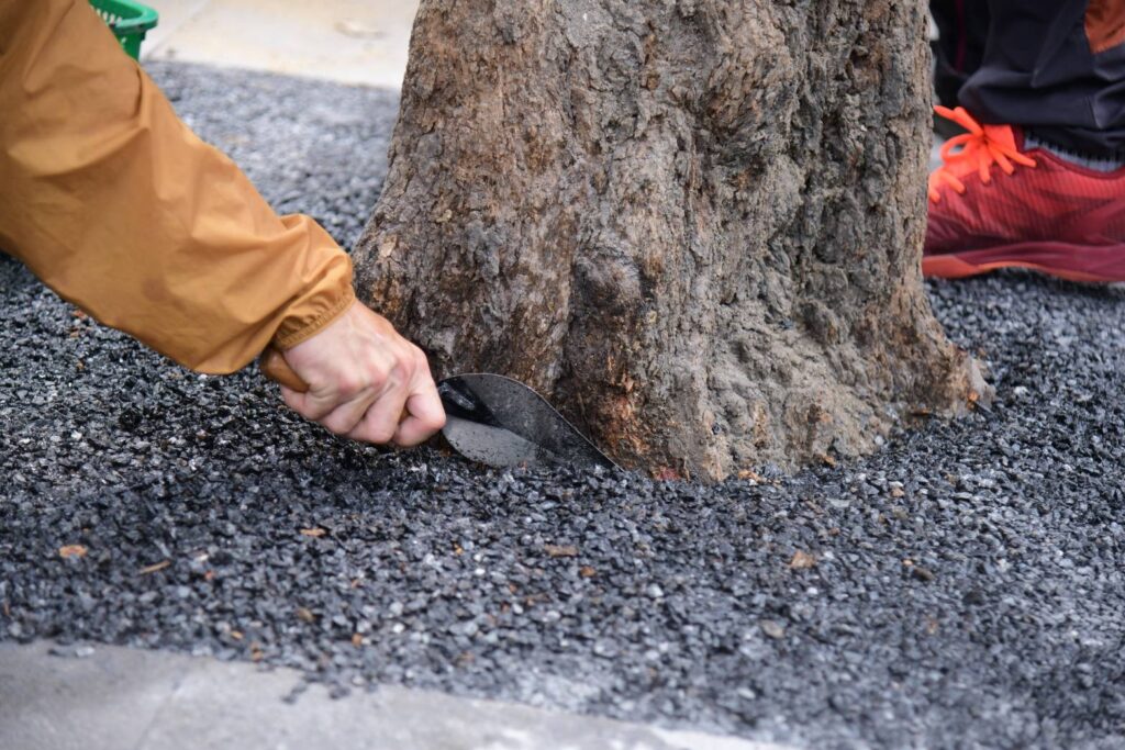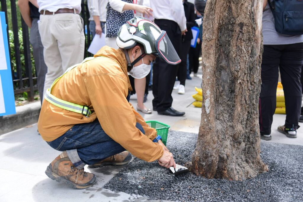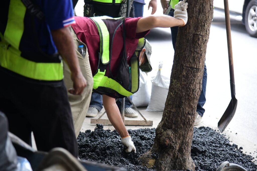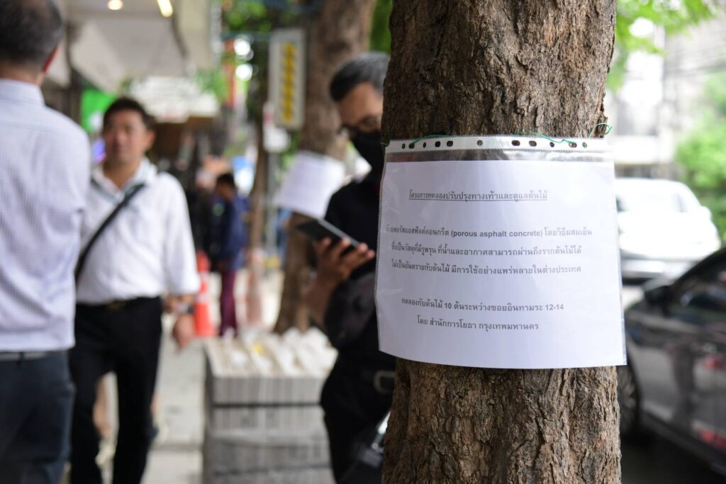 ผู้ว่าฯ ชัชชาติ กล่าวว่า กทม.อยู่ระหว่างปรับปรุงทางเท้าใน 17 เส้นทาง โดยในปีนี้จะดำเนินการประมาณ 200 กิโลเมตร สิ่งที่สำคัญ คือต้นไม้บนทางเท้าต้องสามารถรดน้ำได้และหายใจได้ ซึ่งจากการไปดูงานที่เมืองฟุกุโอกะ ประเทศญี่ปุ่น เมื่อ 2 สัปดาห์ที่ผ่านมา พบว่ามีการใช้ยางมะตอยพอรัสแอสฟัลต์ปูบนทางเท้าก่อนใช้กระเบื้องปูทับเพื่อให้น้ำสามารถซึมลงไปได้ และยังสามารถช่วยเมืองในกรณีระบายน้ำจากถนนได้ด้วย เนื่องจากพอรัสแอสฟัลต์ เป็นแอสฟัลต์ประเภทที่มีรูพรุน มีคุณสมบัติเด่นในการระบายน้ำในแนวดิ่ง ทำให้รากต้นไม้สามารถระบายอากาศและรับการรดน้ำได้ดี และช่วยเพิ่มพื้นที่ทางเท้าได้บางส่วน ซึ่งก่อนจะเทต้องมีการปรับปรุงดินและใส่ปุ๋ยให้เรียบร้อย จากนั้นใส่ทรายใส่กรวด ก่อนดำเนินการลาดยางมะตอย ทำให้น้ำลงไปที่รากต้นไม้ได้เต็มที่ 100%