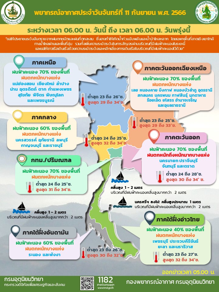 กรมอุตุนิยมวิทยา พยากรณ์อากาศ 24 ชั่วโมงข้างหน้า ร่องมรสุมกำลังปานกลางพาดผ่านภาคเหนือ และภาคตะวันออกเฉียงเหนือตอนบน เข้าสู่หย่อมความกดอากาศต่ำบริเวณประเทศจีนตอนใต้ ประกอบกับมรสุมตะวันตกเฉียงใต้กำลังปานกลางพัดปกคลุมทะเลอันดามัน ภาคตะวันออกเฉียงเหนือตอนล่าง ภาคกลาง ภาคตะวันออก ภาคใต้ และอ่าวไทย ลักษณะเช่นนี้ทำให้ประเทศไทยยังคงมีฝนฟ้าคะนองเกิดขึ้นได้ และมีฝนตกหนักบางแห่ง ขอให้ประชาชนในบริเวณดังกล่าวระวังอันตรายจากฝนตกหนักและฝนที่ตกสะสมซึ่งอาจทำให้เกิดน้ำท่วมฉับพลันและน้ำป่าไหลหลาก โดยเฉพาะพื้นที่ลาดเชิงเขาใกล้ทางน้ำไหลผ่านและพื้นที่ลุ่ม รวมทั้งเพิ่มความระมัดระวังในการสัญจรผ่านบริเวณที่มีฝนฟ้าคะนองในระยะนี้ไว้ด้วย สำหรับบริเวณอ่าวไทยตอนบน ทะเลมีคลื่นสูงประมาณ 2 เมตร ส่วนบริเวณทะเลอันดามัน มีคลื่นสูง 1-2 เมตร บริเวณที่มีฝนฟ้าคะนองคลื่นสูงมากกว่า 2 เมตร ขอให้ชาวเรือในบริเวณดังกล่าวเดินเรือด้วยความระมัดระวังและหลีกเลี่ยงการเดินเรือในบริเวณที่มีฝนฟ้าคะนองไว้ด้วย