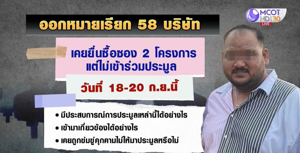 กองคดีฯ ย้ำว่าที่บอกว่าพิรุธ หรือเรียกว่ามีพฤติการณ์น่าสงสัย เนื่องจากมีบริษัท 58 บริษัท ยื่น “ซื้อ” ซองทั้ง 2 โครงการ แต่เมื่อถึงเวลาประกวดราคาแบบอิเล็กทรอนิกส์กลับไม่เข้าร่วมในขั้นตอนการประมูล เพื่อให้ความจริงเป็นที่ประจักษณ์ กองคดีฯ จึงได้ออกหมายเรียก 58 บริษัทนี้มาสอบถามในวันที่ 18-20 กันยายนนี้ โดยคำถามจะมีทั้งมีประสบการณ์เกี่ยวกับการประมูลเหล่านี้ได้อย่างไร เข้ามาเกี่ยวข้องได้อย่างไร และระหว่างนั้น เคยถูกข่มขู่คุกคาม บังคับขู่เข็ญไม่ให้เข้ามาในวันประมูลหรือไม่