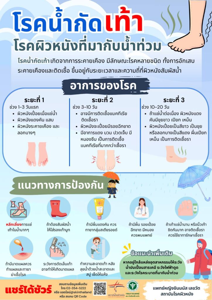 แพทย์หญิงชินมนัส เลขวัต แพทย์ผู้เชี่ยวชาญด้านโรคผิวหนัง สถาบันโรคผิวหนัง กล่าวเพิ่มเติมว่า แนวทางการดูแลผู้ป่วยโรคน้ำกัดเท้า 1.หลีกเลี่ยงการแช่เท้าในน้ำมาก ๆ 2.ถ้าเลี่ยงไม่ได้ต้องสัมผัสน้ำให้ใส่รองเท้าบูท เมื่อขึ้นจากน้ำให้ล้างเท้าด้วยน้ำสบู่ เช็ดเท้าให้แห้งอยู่เสมอและทาครีมบำรุงผิว 3.ถ้ามีผื่นแดงเล็กน้อย คัน ควรทายากลุ่มสเตียรอยด์ 4.ถ้ามีผื่นและมีรอยเปื่อยฉีกขาดของผิว มีอาการบวมแดง ปวดเจ็บ หรือมีหนองเป็นอาการติดเชื้อแบคทีเรียที่รุนแรงขึ้น ควรพบแพทย์ 5.ถ้าเท้าแช่น้ำนานหลายสัปดาห์ต่อเนื่องหรือนิ้วเท้าเกยหรือชิดกันมาก ทำให้อาจติดเชื้อราที่ง่ามนิ้วเท้าเกิดเป็นผื่นขุยเปียกขาว ควรใช้ยาทารักษาเชื้อรา 6.ถ้ามีบาดแผลควรทำแผลและทายาฆ่าเชื้อโรค เช่น เบตาดีน 7.ระวังการตัดเล็บเท้าเพราะอาจเกิดบาดแผลเป็นทางเข้าของเชื้อโรค 8.ทำความสะอาดเท้า ง่ามเท้าของเล็บทุกครั้งหลังลุยน้ำด้วยน้ำสะอาดและสบู่ เช็ดให้แห้ง ข้อแนะนำเพิ่มเติม หากอยู่ใกล้แหล่งอุตสาหกรรมให้ระวังน้ำปนเปื้อนสารเคมี ระวังไฟฟ้าดูด ควรรับประทานอาหารและดื่มน้ำที่สะอาด สวมเสื้อผ้าที่มิดชิด ระวังแมลงกัด และระวังโรคระบาดที่มากับน้ำท่วม เช่น โรคอุจจาระร่วง โรคไข้เลือดออก ดังนั้น หากเท้ามีความผิดปกติควรรีบพบแพทย์. -สำนักข่าวไทย
