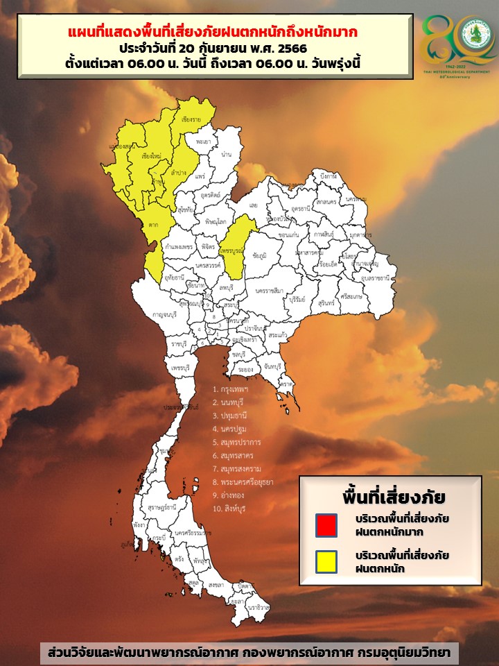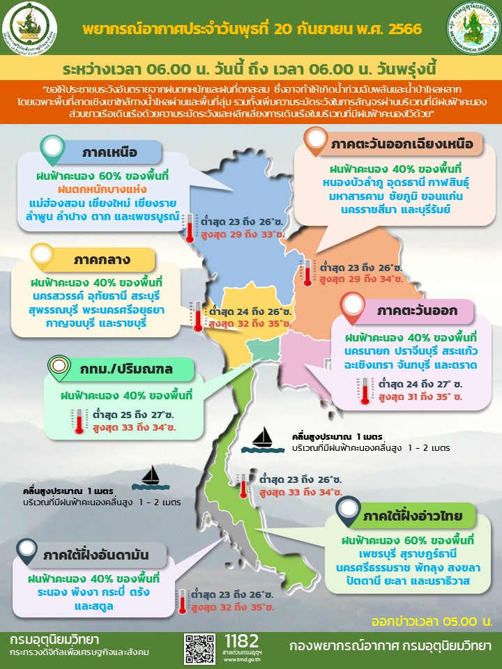 กรมอุตุนิยมวิทยา พยากรณ์อากาศ 24 ชั่วโมงข้างหน้า มรสุมตะวันตกเฉียงใต้กำลังอ่อนพัดปกคลุมทะเลอันดามัน ประเทศไทย และอ่าวไทย ในขณะที่ลมตะวันออกและลมตะวันออกเฉียงใต้พัดปกคลุมภาคตะวันออกเฉียงเหนือตอนล่าง ลักษณะเช่นนี้ทำให้ภาคเหนือมีฝนตกหนักบางแห่ง ขอให้ประชาชนในบริเวณดังกล่าวระวังอันตรายจากฝนตกหนักและฝนตกสะสม ซึ่งอาจทำให้เกิดน้ำท่วมฉับพลันและน้ำป่าไหลหลาก โดยเฉพาะพื้นที่ลาดเชิงเขาใกล้ทางน้ำไหลผ่านและพื้นที่ลุ่ม รวมทั้งเพิ่มความระมัดระวังในการสัญจรผ่านบริเวณที่มีฝนฟ้าคะนอง