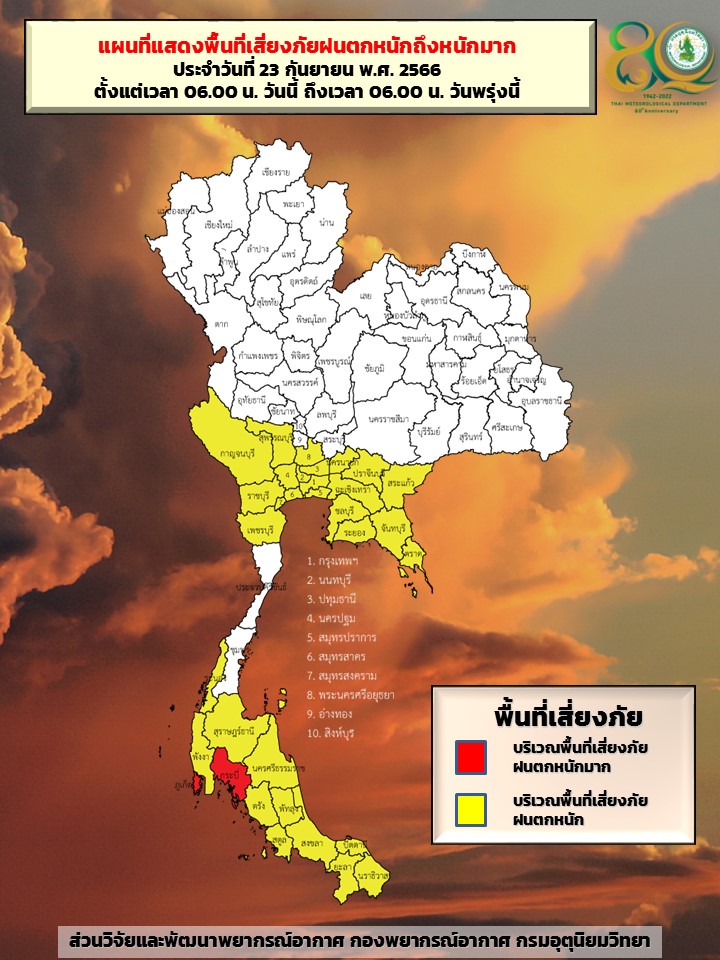 กรมอุตุนิยมวิทยา เผยร่องมรสุมพาดผ่านภาคกลางตอนล่างรวมทั้งกรุงเทพมหานครและปริมณฑล ภาคตะวันออก และภาคใต้ตอนบนประกอบกับมรสุมตะวันตกเฉียงใต้ที่พัดปกคลุมทะเลอันดามัน ภาคใต้ และอ่าวไทย มีกำลังแรงขึ้น ลักษณะเช่นนี้ทำให้ประเทศไทยยังคงมีฝนฟ้าคะนอง และมีฝนตกหนักบางแห่งในภาคกลางรวมทั้งกรุงเทพมหานครและปริมณฑล และภาคตะวันออก โดยมีฝนตกหนักมากบริเวณภาคใต้ ขอให้ประชาชนในบริเวณดังกล่าวระวังอันตรายจากฝนตกหนักถึงหนักมาก ซึ่งอาจทำให้เกิดน้ำท่วมฉับพลันและน้ำป่าไหลหลาก โดยเฉพาะพื้นที่ลาดเชิงเขาใกล้ทางน้ำไหลผ่านและพื้นที่ลุ่ม รวมทั้งเพิ่มความระมัดระวังในการสัญจรผ่านบริเวณที่มีฝนฟ้าคะนองและหลีกเลี่ยงการอยู่ในที่โล่งแจ้ง ใต้ต้นไม้ใหญ่ และป้ายโฆษณาที่ไม่แข็งแรง