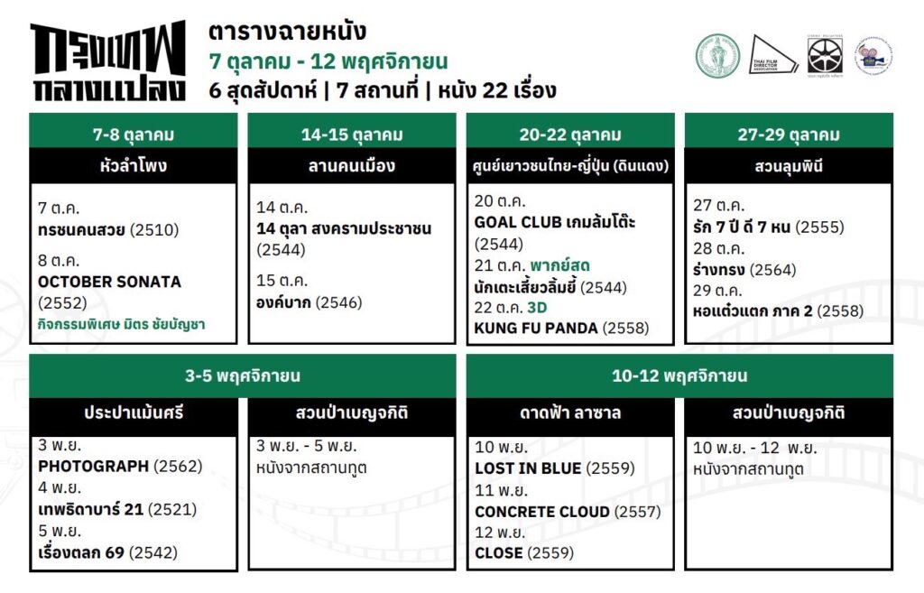กรุงเทพมหานคร ร่วมกับ สมาคมผู้กำกับภาพยนตร์ไทย หอภาพยนตร์ (องค์การมหาชน) และสมาคมหนังกลางแปลงแห่งประเทศไทย จัดงานเทศกาล “กรุงเทพกลางแปลง” ระหว่างวันที่ 7 ต.ค.-12 พ.ย.66 กับ 6 สุดสัปดาห์ 7 สถานที่ หนัง 22 เรื่อง โดยมีตารางฉายหนัง ดังนี้ วันที่ 7-8 ตุลาคม 2566 สถานที่ หัวลำโพง โดยวันที่ 7 ต.ค. ฉายเรื่อง ทรชนคนสวย (2510) และวันที่ 8 ต.ค. ฉายเรื่อง OCTOBER SONATA (2552) และกิจกรรมพิเศษ มิตร ชัยบัญชา วันที่ 14-15 ตุลาคม 2566 สถานที่ ลานคนเมือง โดยวันที่ 14 ต.ค. ฉายเรื่อง 14 ตุลา สงครามประชาชน (2544) และวันที่ 15 ต.ค. ฉายเรื่อง องค์บาก (2546) วันที่ 20-22 ตุลาคม 2566 สถานที่ ศูนย์เยาวชนไทย-ญี่ปุ่น (ดินแดง) โดยวันที่ 20 ต.ค. ฉายเรื่อง GOAL CLUB เกมล้มโต๊ะ (2544) วันที่ 21 ต.ค. ฉายเรื่อง นักเตะเสี้ยลิ้มยี้ (2544) พากย์สด และวันที่ 22 ต.ค. ฉายเรื่อง KUNG FU PANDA (2558) 3D