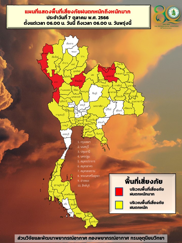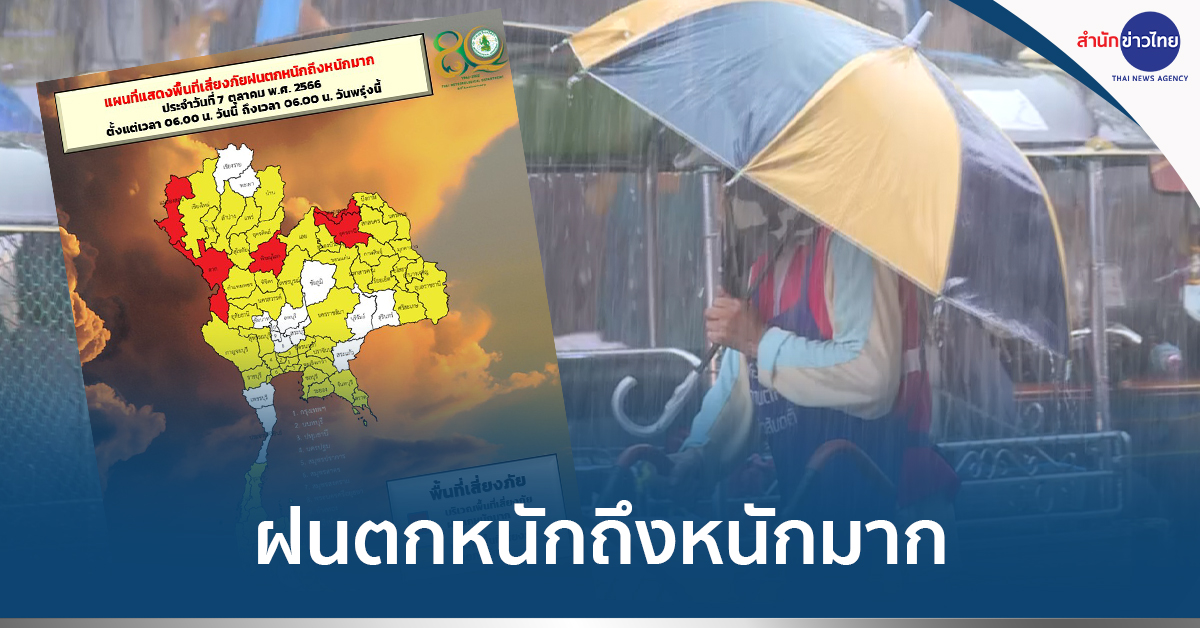 กทม. 7 ต.ค.- กรมอุตุฯ เผยทั่วไทยยังคงมีฝนตกหนักบางแห่ง เตือน “เหนือ-อีสาน” เตรียมรับมือฝนถล่ม อาจเกิดน้ำท่วมฉับพลันและน้ำป่าไหลหลาก