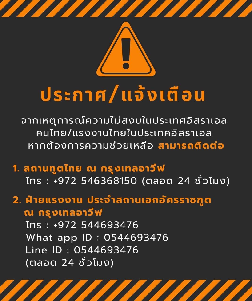 สำหรับคนไทยที่ได้รับผลกระทบ โปรดติดต่อได้ที่สถานเอกอัครราชทูตฯ หมายเลขโทรศัพท์ (+972) 5 4636 8150 กองคุ้มครองและดูแลผลประโยชน์คนไทยในต่างประเทศ หมายเลข 0 2575 1047-51 ฝ่ายแรงงานไทย ประจำสถานเอกอัครราชทูต ณ กรุงเทลอาวีฟ โทร : +972 544693476 What app ID : 0544693476 Line ID : 0544693476 (ตลอด 24 ชั่วโมง). – สำนักข่าวไทย