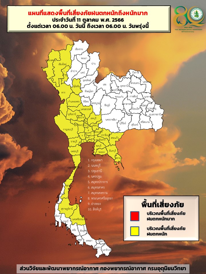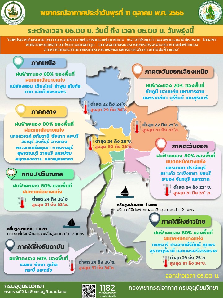 กรมอุตุฯ 11 ต.ค. – กรมอุตุฯ เผยภาคเหนือ ภาคกลาง ภาคตะวันออก และภาคใต้ฝั่งตะวันออก มีฝนตกหนักบางแห่ง ส่วนกรุงเทพฯ และปริมณฑล ฝนฟ้าคะนอง 80% ของพื้นที่ และตกหนักบางแห่ง