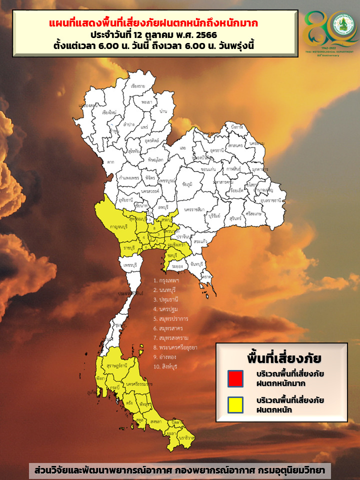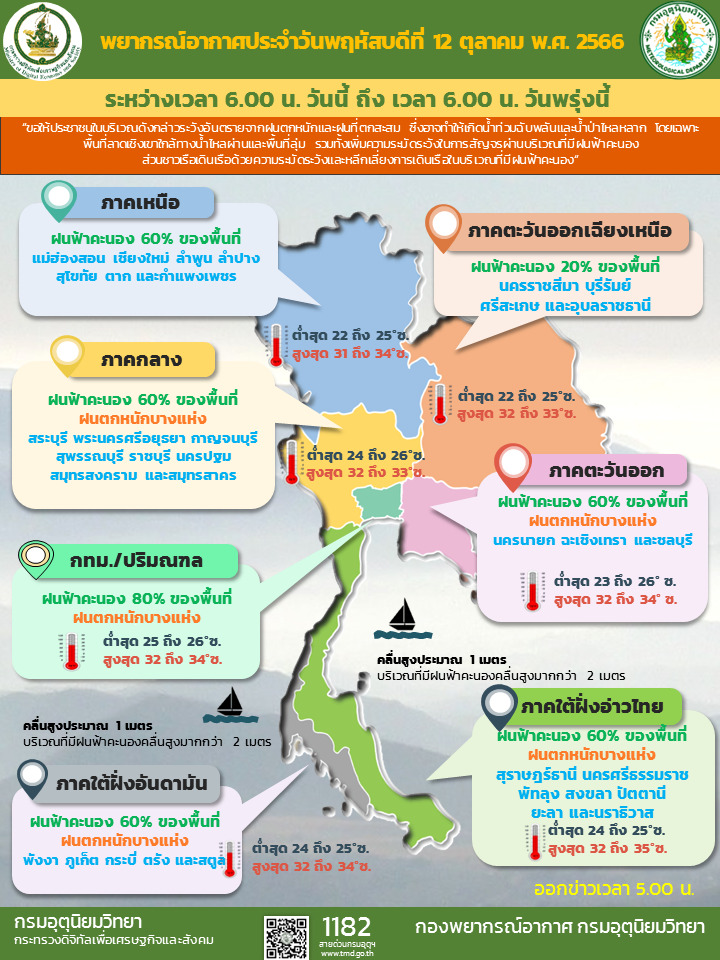 กรมอุตุฯ 12 ต.ค. – กรมอุตุฯ เผยทั่วไทยมีฝนฟ้าคะนอง และมีฝนตกหนักบางแห่งในภาคกลาง ภาคตะวันออก และภาคใต้ ส่วนกรุงเทพฯ และปริมณฑล ฝนฟ้าคะนอง 80% ของพื้นที่ และตกหนักบางแห่ง