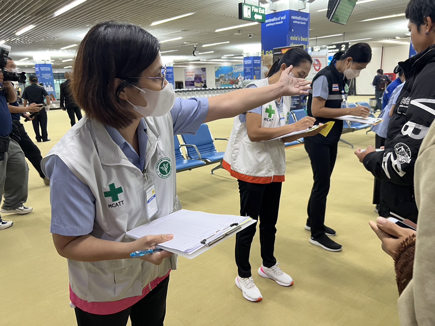 นพ.สุรโชค กล่าวต่อว่า กระทรวงสาธารณสุขได้มอบหมายให้สำนักงานควบคุมป้องกันโรคที่ 6 ชลบุรี กองด่านควบคุมโรคติดต่อระหว่างประเทศและกักกันโรค สนามบินอู่ตะเภา สำนักงานสาธารณสุขจังหวัดระยอง สำนักงานสาธารณสุขอำเภอบ้านฉาง โรงพยาบาลบ้านฉาง โรงพยาบาลระยอง และศูนย์สุขภาพจิตที่ 6 ชลบุรี ปฏิบัติงานร่วมกับการท่าอากาศยานอู่ตะเภา กระทรวงแรงงาน และกระทรวงการพัฒนาสังคมและความมั่นคงของมนุษย์ (พม.) ในการดำเนินการคัดกรองสุขภาพผู้เดินทาง โดยใช้เวลาในการคัดกรองประมาณ 1 ชั่วโมง เบื้องต้นมีผู้ได้รับบาดเจ็บ 2 ราย โดยรายแรกมีบาดแผลจากสะเก็ดระเบิด ส่วนอีกรายปวดบวมที่มือขวาเล็กน้อยจากการหกล้ม ซึ่งทั้ง 2 รายได้รับการดูแลที่จุดปฐมพยาบาลที่จัดเตรียมไว้ในสนามบิน ภาพรวมถือว่าอาการดี สามารถเดินทางกลับภูมิลำเนาได้