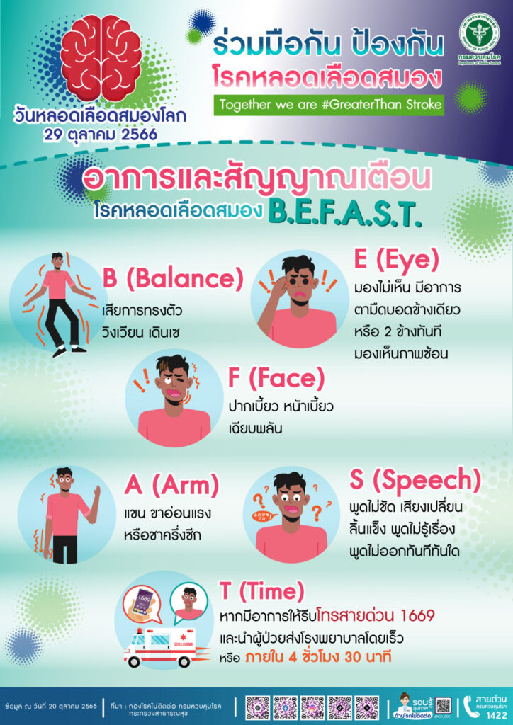 นายแพทย์ธงชัย กีรติหัตถยากร รักษาการแทนอธิบดีกรมควบคุมโรค กล่าวว่า โรคหลอดเลือดสมองเป็นหนึ่งในสาเหตุหลักของการเสียชีวิตและความพิการที่สำคัญทั่วโลกและมีแนวโน้มเพิ่มขึ้นอย่างต่อเนื่อง ทั่วโลกพบว่า 1 ใน 4 ของประชากรที่มีอายุมากกว่า 25 ปีขึ้นไป เป็นโรคหลอดเลือดสมอง และ 90% ของโรคหลอดเลือดสมองสามารถป้องกันได้ องค์การโรคหลอดเลือดสมองโลก (World Stroke Organization: WSO) ได้กำหนดให้วันที่ 29 ตุลาคมของทุกปี เป็นวันหลอดเลือดสมองโลก ประเด็นการรณรงค์ในปี 2566 คือ Together we are #GreaterThan Stroke : ร่วมมือกันป้องกันโรคหลอดเลือดสมอง โดยมุ่งเน้นการมีส่วนร่วมของทุกภาคส่วนสร้างความตระหนักรู้เพื่อป้องกันโรคหลอดเลือดสมองแก่ประชาชน ดังนั้นการป้องกันโรคหลอดเลือดสมองเป็นบทบาทที่ทุกคน ควรร่วมมือกันแก้ปัญหาหากทุกคนมีส่วนร่วมและร่วมมือกันจะช่วยลดอัตราป่วยและเสียชีวิตจากโรคหลอดเลือดสมอง
