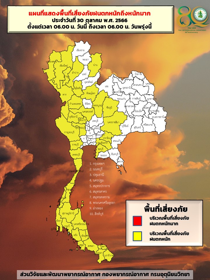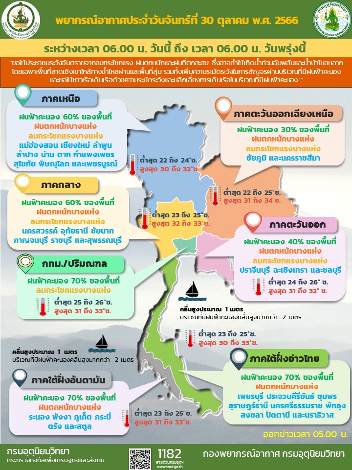 กรมอุตุฯ 30 ต.ค. – กรมอุตุฯ เผยทั่วไทยมีฝนฟ้าคะนอง ลมกระโชกแรง และมีฝนตกหนักบางแห่ง ระวังน้ำท่วมฉับพลัน-น้ำป่าไหลหลาก ส่วนกรุงเทพฯ และปริมณฑล ฝนฟ้าคะนอง 70% ของพื้นที่ กับมีลมกระโชกแรงบางแห่ง