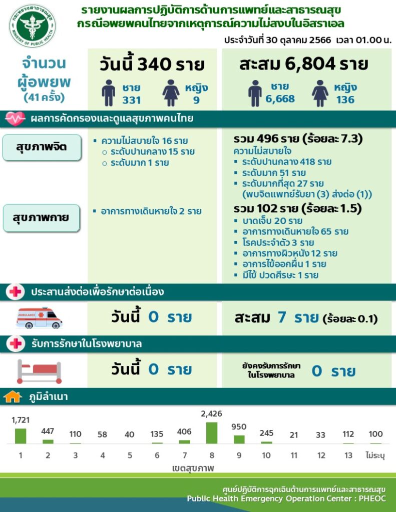 นายแพทย์ธงชัย กีรติหัตถยากร รักษาราชการแทนอธิบดีกรมควบคุมโรค กล่าวว่า โรคฝีดาษวานรเป็นโรคติดต่อที่ต้องเฝ้าระวัง สามารถติดต่อได้ง่ายเพียงแค่สัมผัสบริเวณตุ่ม หนอง หรือสารคัดหลั่งของผู้ติดเชื้อ สถานการณ์โรคฝีดาษวานรในประเทศไทย (ข้อมูล ณ วันที่ 28 ตุลาคม 2566) พบผู้ติดเชื้อรวม 559 ราย เสียชีวิต 1 ราย เป็นผู้ป่วยภูมิคุ้มกันบกพร่อง ชาวไทย 503 ราย ชาวต่างชาติ 52 ราย ไม่ระบุสัญชาติ 4 ราย ส่วนใหญ่เป็นกลุ่มหลากหลายทางเพศ 474 ราย และรู้ว่าติดเชื้อ HIV 274 ราย คิดเป็นร้อยละ 44.18 กลุ่มอายุที่พบมากที่สุดคือ กลุ่มอายุ 30-39 ปี (241 ราย) ตามด้วยอายุ 20-29 ปี (172 ราย)