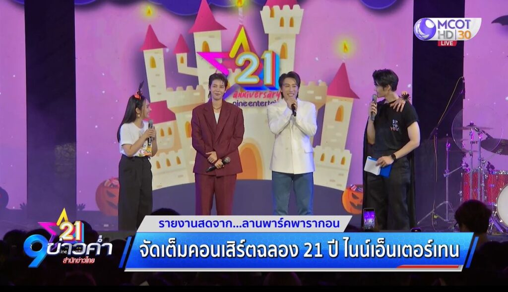 กรุงเทพฯ 31 ต.ค. – วันฮาโลวีนปีนี้ตรงกับกิจกรรมฟรีคอนเสิร์ตครบรอบ 21 ปี ไนน์เอ็นเตอร์เทน มีศิลปินมาร่วมงานจัดเต็มแสดงมาราธอนกว่า 7 ชั่วโมง