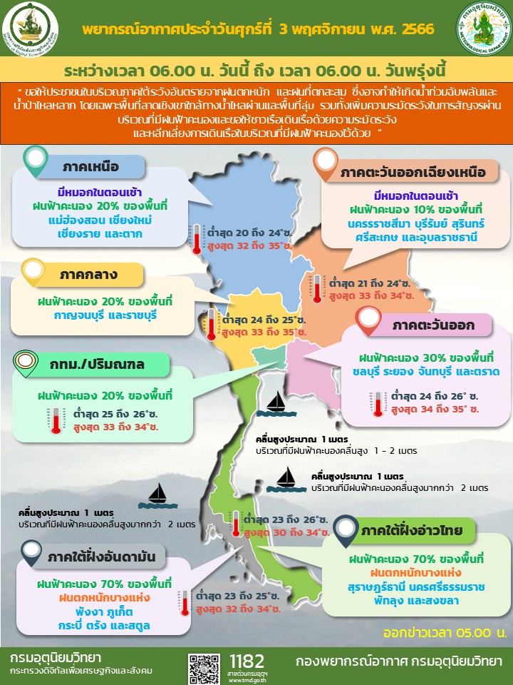 กรมอุตุฯ 3 พ.ย. – กรมอุตุฯ เผยไทยตอนบนมีหมอกตอนเช้าและมีฝนเพิ่มขึ้น ขณะที่ภาคใต้ยังมีฝนตกหนักบางแห่ง ส่วนกรุงเทพฯ และปริมณฑล ฝนฟ้าคะนอง 20% ของพื้นที่