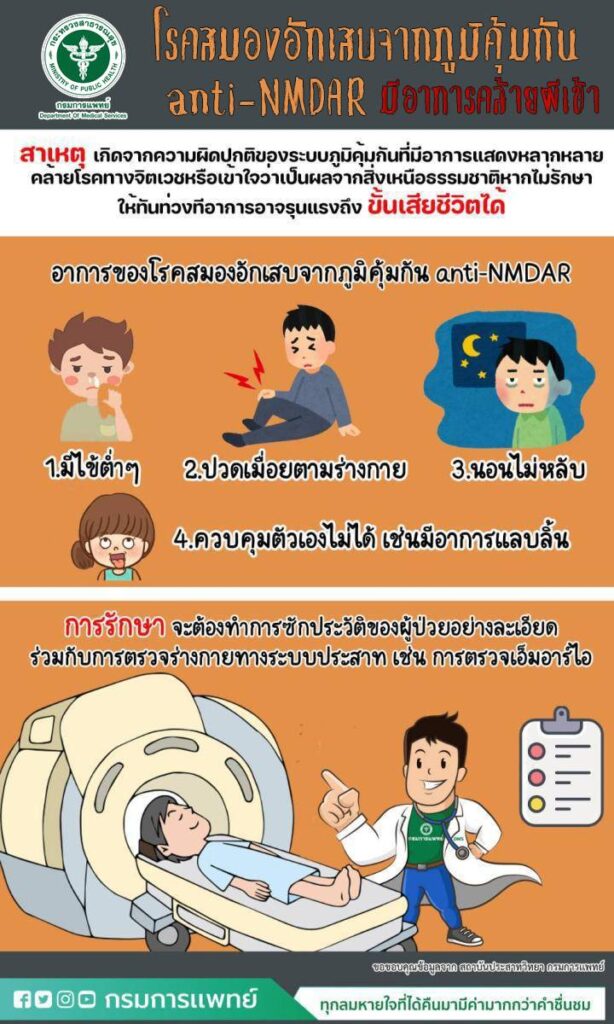3 พ.ย. – สถาบันประสาทวิทยา เผยสาเหตุความผิดปกติคล้ายอาการผีเข้าอาจเกิดจากโรคสมองอักเสบจากภูมิคุ้มกัน anti-NMDAR ที่มีอาการแสดงหลากหลายคล้ายโรคทางจิตเวช หรือเข้าใจว่าเป็นผลจากสิ่งเหนือธรรมชาติ หากไม่รักษาให้ทันท่วงทีอาการอาจรุนแรงถึงขั้นเสียชีวิตได้