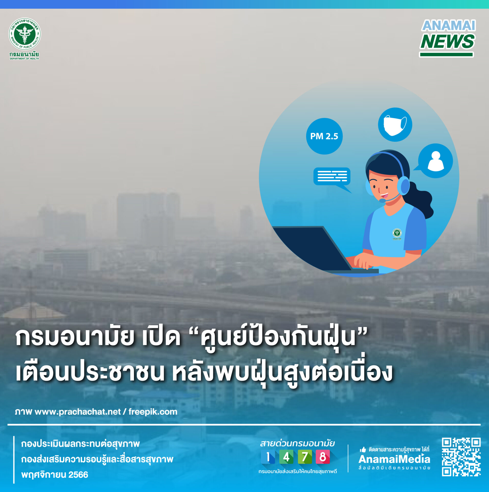 กรุงเทพฯ 5 พ.ย. – กรมอนามัย กระทรวงสาธารณสุข พร้อมเปิดศูนย์เฝ้าระวังและประสานงานด้านการป้องกันผลกระทบต่อสุขภาพ กรณีหมอกควันและฝุ่นละอองขนาดเล็ก ทั้งส่วนกลางและส่วนภูมิภาค เพิ่มความมั่นใจให้ประชาชน พร้อมแนะกลุ่มเสี่ยงดูแลสุขภาพเป็นพิเศษ