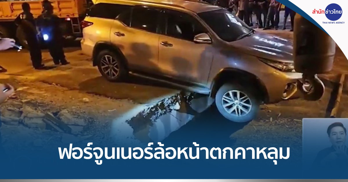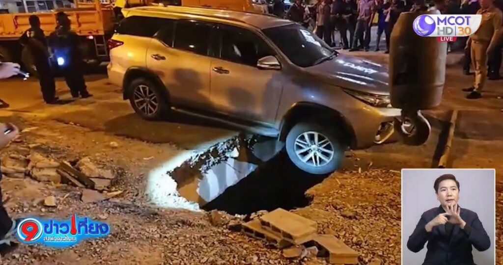 กรุงเทพฯ 7 พ.ย. – ระทึกกลางกรุง! ถนนทรุดตัวจากฝาบ่อพักน้ำแตกหัก ฟอร์จูนเนอร์ล้อหน้าตกคาหลุม บนถนนราชปรารถขาออก บริเวณแยกมักกะสัน-จตุรทิศ เจ้าหน้าที่เร่งซ่อมตลอดคืน ล่าสุดเปิดการจราจรได้แล้ว