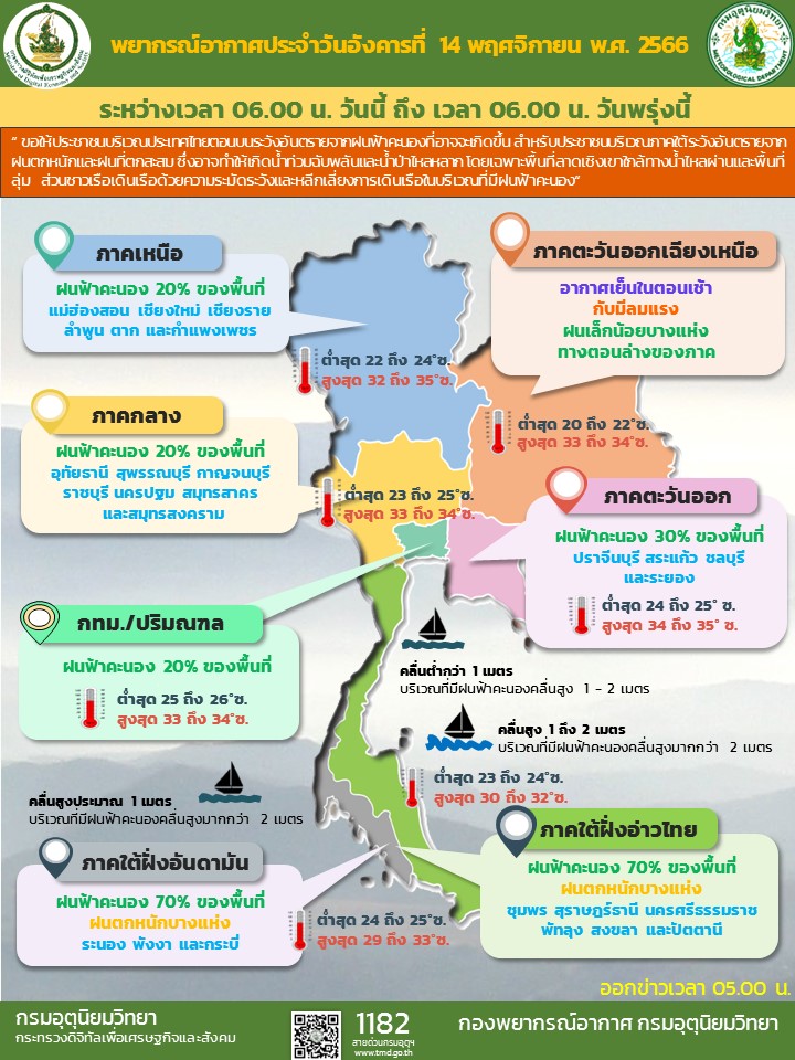 กรุงเทพฯ 14 พ.ย. – อุตุฯ เผยภาคเหนือ ภาคตะวันออก ภาคกลาง ยังคงมีฝนฟ้าคะนองบางแห่ง ขณะที่ภาคอีสานมีอากาศเย็นตอนเช้าและมีฝนเล็กน้อย สำหรับภาคใต้ยังมีฝนตกหนักบางแห่ง