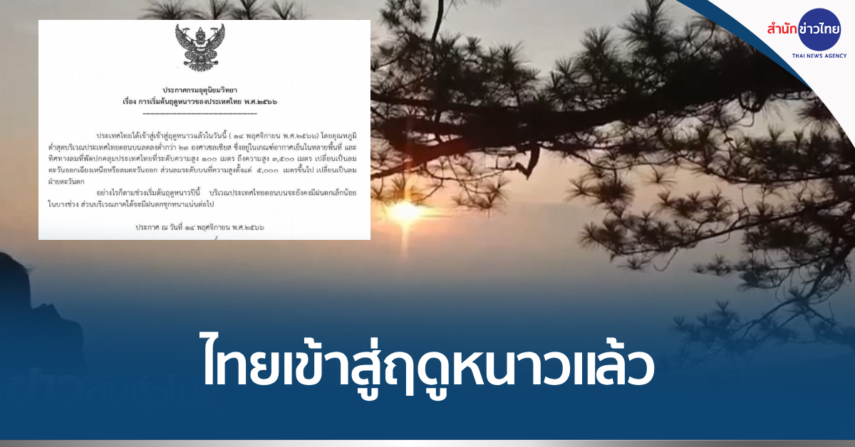 กรมอุตุนิยมวิทยาออกประกาศประเทศไทยเข้าสู่ฤดูหนาวอย่างเป็นทางการวันนี้ (14 พ.ย.) โดยอุณหภูมิต่ำสุดบริเวณประเทศไทยตอนบน ลดลงต่ำกว่า 23 องศาเซลเชียส อยู่ในเกณฑ์อากาศเย็นในหลายพื้นที่ คาดจะหนาวเย็นน้อยกว่าปีที่แล้ว ซึ่งอุณหภูมิเฉลี่ยอยู่ที่ 20.8 องศาเซลเซียส ส่วนอุณหภูมิต่ำสุดบริเวณกรุงเทพฯ และปริมณฑล 15-18 องศาเซลเซียส และฤดูหนาวจะสิ้นสุดประมาณเดือนกุมภาพันธ์ 2567 อย่างไรก็ตาม ช่วงเริ่มต้นฤดูหนาวปีนี้บริเวณประเทศไทยตอนบนจะยังคงมีฝนตกเล็กน้อยในบางช่วง ส่วนบริเวณภาคใต้จะมีฝนตกชุกหนาแน่น.-สำนักข่าวไทย