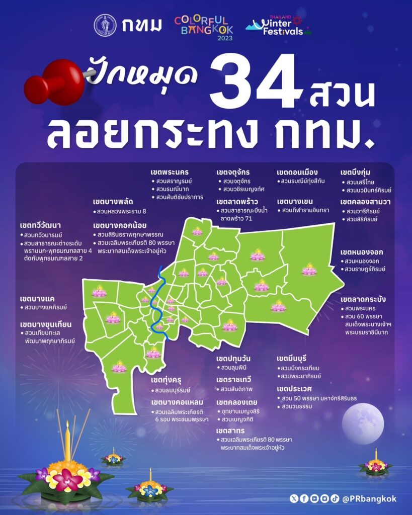 นายเอกวรัญญู อัมระปาล ผู้ช่วยเลขานุการผู้ว่าราชการกรุงเทพมหานคร และโฆษกของกรุงเทพมหานคร เปิดเผยว่า เทศกาลลอยกระทงในปีนี้ ตรงกับวันจันทร์ที่ 27 พฤศจิกายน 2566 เพื่อเป็นการร่วมสืบสานและอนุรักษ์วัฒนธรรมประเพณีลอยกระทง กรุงเทพมหานคร กำหนดเปิดสวนสาธารณะ 34 แห่ง เพื่อให้ประชาชนลอยกระทง ได้แก่ 1.สวนลุมพินี เขตปทุมวัน 2.สวนจตุจักร เขตจตุจักร 3.สวนวชิรเบญจทัศ เขตจตุจักร 4.สวนพระนคร เขตลาดกระบัง 5.สวน 60 พรรษา สมเด็จพระนางเจ้าฯ พระบรมราชินีนาถ เขตลาดกระบัง 6.สวนสราญรมย์ เขตพระนคร 7.สวนรมณีนาถ เขตพระนคร 8.สวนสันติชัยปราการ เขตพระนคร 9.สวนธนบุรีรมย์ เขตทุ่งครุ 10.สวนเสรีไทย เขตบึงกุ่ม 11.สวนนวมินทร์ภิรมย์ เขตบึงกุ่ม 12.สวนหนองจอก เขตหนองจอก 13.สวนราษฎร์ภิรมย์ เขตหนองจอก 14.อุทยานเบญจสิริ เขตคลองเตย 15.สวนเบญจกิติ เขตคลองเตย 16.สวนบึงกระเทียม เขตมีนบุรี 17.สวนพระยาภิรมย์ เขตมีนบุรี 18.สวนวารีภิรมย์ เขตคลองสามวา 19.สวนสิริภิรมย์ เขตคลองสามวา 20.สวนเฉลิมพระเกียรติ 6 รอบพระชนมพรรษา เขตบางคอแหลม