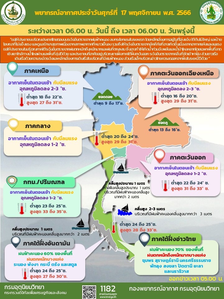 ภาคกลาง : อากาศเย็นในตอนเช้ากับมีลมแรง อุณหภูมิจะลดลง 1-2 องศาเซลเซียส อุณหภูมิต่ำสุด 20-24 องศาเซลเซียส อุณหภูมิสูงสุด 29-31 องศาเซลเซียส ลมตะวันออกเฉียงเหนือ ความเร็ว 10-30 กม./ชม.