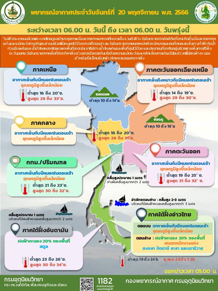 กรมอุตุฯ 20 พ.ย. – กรมอุตุฯ เผยทั่วไทยอากาศเย็นในตอนเช้า ภาคอีสานอากาศเย็นถึงหนาว กับมีหมอกตอนเช้า ขณะที่ภาคใต้ตอนล่างฝนตกหนักถึงหนักมากบางแห่ง
