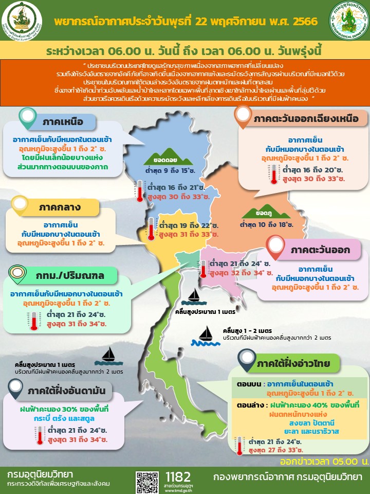 กรมอุตุฯ 22 พ.ย. – กรมอุตุฯ เผยทั่วไทยอุณหภูมิสูงขึ้น 1-2 องศาฯ กับมีหมอกตอนเช้า โดยภาคเหนือ ภาคอีสาน ภาคกลาง รวมทั้งกรุงเทพฯ และปริมณฑล ภาคตะวันออก และภาคใต้ตอนบน ยังคงมีอากาศเย็นในตอนเช้า