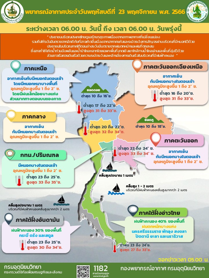 กรมอุตุฯ 23 พ.ย. – กรมอุตุฯ เผยไทยตอนบนอุณหภูมิสูงขึ้น 1-2 องศาฯ แต่ยังคงมีอากาศเย็นกับมีหมอกในตอนเช้า โดยมีหมอกหนาบางพื้นที่ในภาคเหนือ ขณะที่ภาคใต้ตอนล่างมีฝนตกหนักบางแห่ง ส่วนกรุงเทพฯ และปริมณฑล มีหมอกบางตอนเช้า อุณหภูมิสูงขึ้นอีก 1-2 องศาฯ