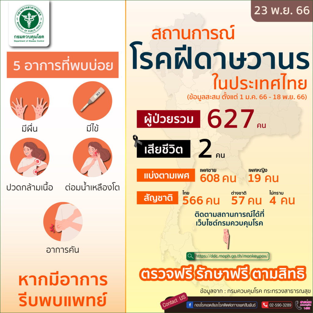 นายแพทย์ธงชัย กีรติหัตถยากร รักษาราชการแทนอธิบดีกรมควบคุมโรค กล่าวว่า จากสถานการณ์โรคฝีดาษวานรในประเทศไทย (ข้อมูลผู้ป่วยยืนยัน ณ วันที่ 18 พฤศจิกายน 2566) พบผู้ติดเชื้อรวม 627 คน เสียชีวิต 2 ราย เป็นคนไทย 566 คน ต่างชาติ 57 คน และไม่ระบุสัญชาติ 4 คน นับเป็นโรคติดต่อที่ยังต้องเฝ้าระวัง เนื่องจากพบผู้ติดเชื้อเพิ่มสูงขึ้นอย่างต่อเนื่อง ส่วนใหญ่ติดจากการสัมผัสใกล้ชิดแนบเนื้อกับผู้ที่มีผื่น ตุ่มหรือหนอง รวมถึงการใช้ของส่วนตัวร่วมกันกับผู้ติดเชื้อโรคฝีดาษวานร