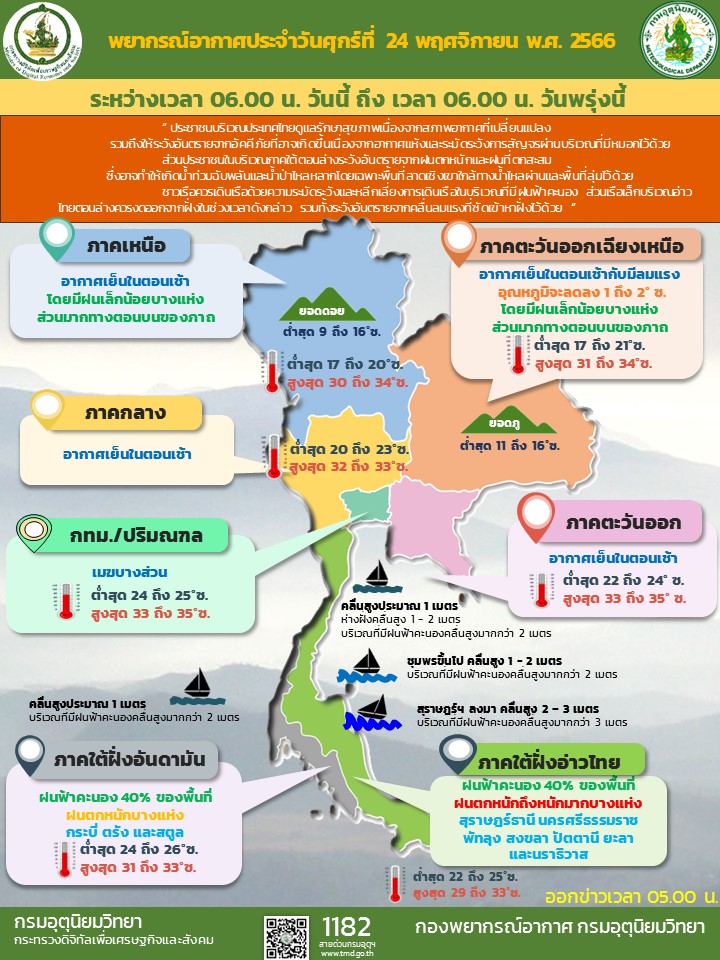 กรมอุตุนิยมวิทยา พยากรณ์อากาศ 24 ชั่วโมงข้างหน้า บริเวณความกดอากาศสูงหรือมวลอากาศเย็นกำลังปานกลางระลอกใหม่จากประเทศจีนได้แผ่ลงมาปกคลุมถึงประเทศเวียดนามตอนบนและทะเลจีนใต้แล้ว คาดว่าจะเคลื่อนเข้าปกคลุมภาคตะวันออกเฉียงเหนือตอนบน ในวันนี้ (24 พ.ย.66) ลักษณะเช่นนี้จะทำให้ภาคตะวันออกเฉียงเหนือมีอุณหภูมิลดลง กับมีลมแรง ส่วนภาคเหนือ ภาคกลาง ภาคตะวันออก มีอากาศเย็นในตอนเช้า ขอให้ประชาชนบริเวณประเทศไทยดูแลรักษาสุขภาพ เนื่องจากสภาพอากาศที่เปลี่ยนแปลง รวมถึงให้ระวังอันตรายจากอัคคีภัยที่อาจเกิดขึ้นเนื่องจากอากาศแห้ง