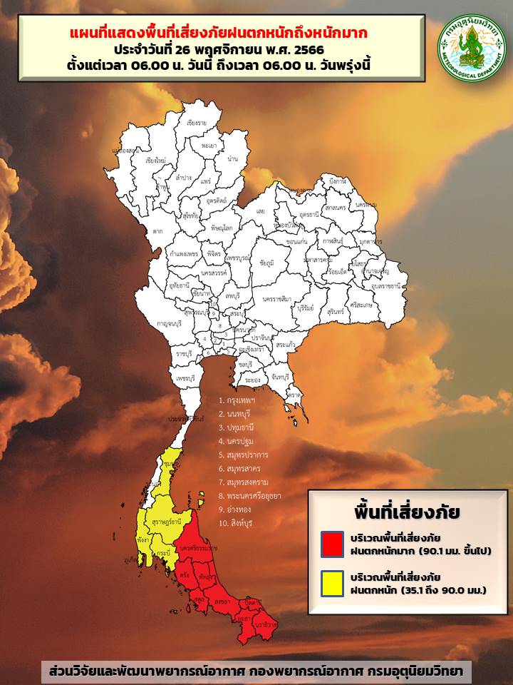 กทม. 26 พ.ย.- กรมอุตุฯ เตือนไทยตอนบนอากาศเปลี่ยนแปลง ช่วงเช้าหนาวเย็นและมีฝนตกบางแห่ง ขณะที่ภาคใต้เตรียมรับมือฝนตกหนักถึงหนักมาก