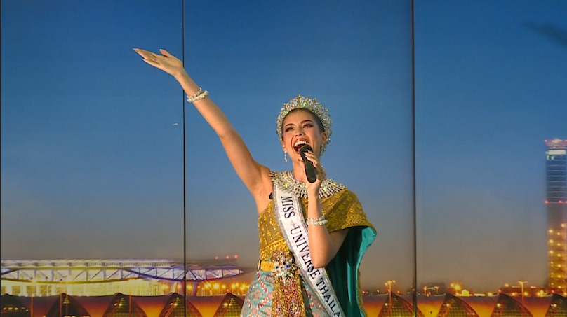 ทันทีที่ แอนโทเนีย เดินออกมาจากประตูทางออกด้วยชุดไทย ขบวนกลองยาวก็เริ่มบรรเลงให้การต้อนรับ แอนโทเนีย และคณะทีมงานกองประกวด Miss Thailand Universe ท่ามกลางเสียงกรี๊ดเรียกชื่อ แอนโทเนีย จากกลุ่มแฟนคลับ ซึ่งปักหลักอยู่บนชั้น 3 และชั้น 4 สร้างความคึกคักให้กับสนามบินเป็นอย่างมาก