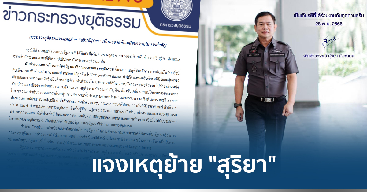 กทม. 28 พ.ย.- กระทรวงยุติธรรม แจงเหตุย้าย “สุริยา” อธิบดีกรมสอบสวนคดีพิเศษ ไปเป็นรองปลัดกระทรวงยุติธรรม เพื่อมาช่วยขับเคลื่อนงานนโยบายสำคัญ