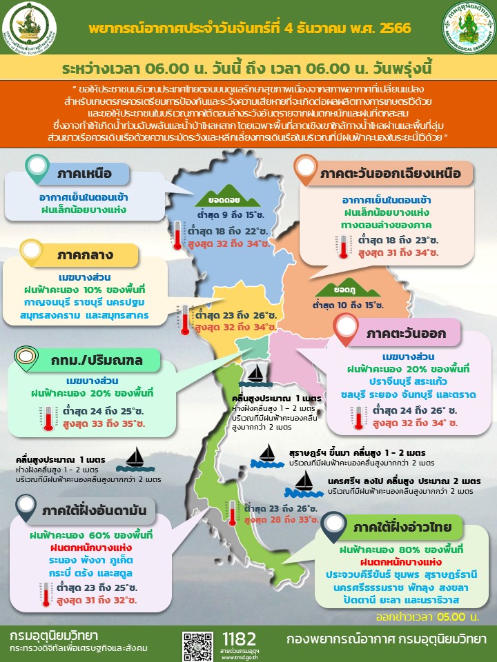 กรุงเทพฯ 4 ธ.ค. – อุตุฯ เผยไทยตอนบนมีฝนบางแห่ง เหนือ-อีสาน ยังคงมีอากาศเย็นตอนเช้า ส่วนภาคใต้ตอนล่าง ฝนตกหนักบางแห่ง อาจทำให้เกิดน้ำท่วมฉับพลัน-น้ำป่าไหลหลาก