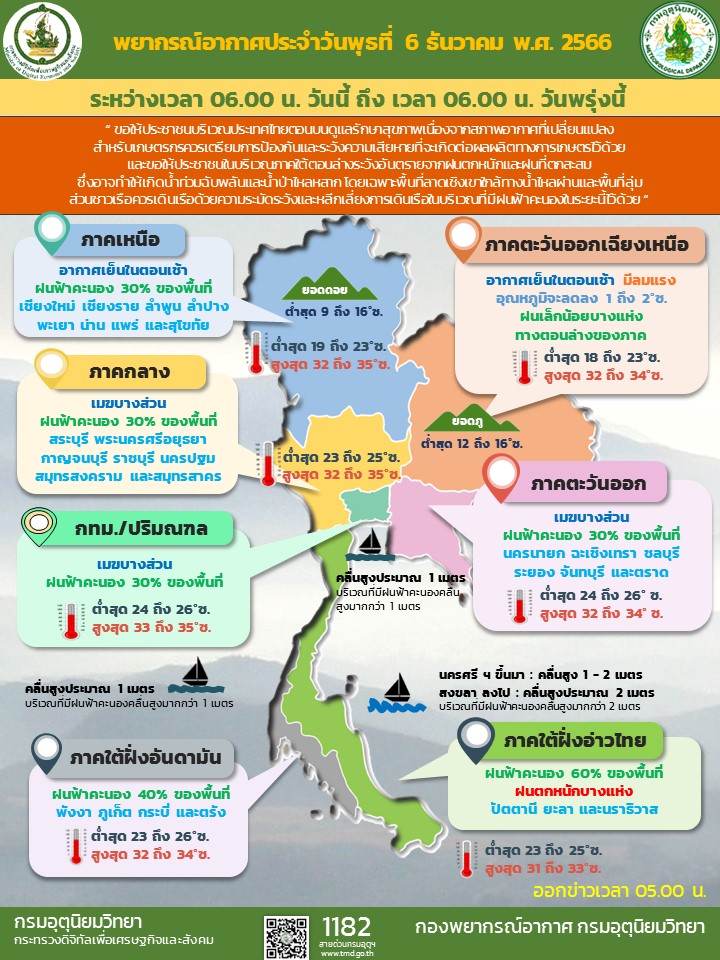 กรมอุตุนิยมวิทยา พยากรณ์อากาศ 24 ชั่วโมงข้างหน้า บริเวณความกดอากาศสูงหรือมวลอากาศเย็นกำลังปานกลางอีกระลอกหนึ่งจากประเทศจีนแผ่ลงมาปกคลุมบริเวณประเทศจีนตอนใต้แล้ว คาดว่าจะแผ่ลงมาปกคลุมภาคเหนือตอนบน และภาคตะวันออกเฉียงเหนือตอนบนของประเทศไทย และทะเลจีนใต้ในวันนี้ (6 ธ.ค. 2566) ในขณะที่ลมฝ่ายตะวันออกยังคงพัดนำความชื้นจากทะเลจีนใต้และอ่าวไทยเข้ามาปกคลุมประเทศไทยตอนบน ลักษณะเช่นนี้ทำให้บริเวณดังกล่าวมีฝนฟ้าคะนองเกิดขึ้นได้บางพื้นที่ในระยะแรก หลังจากนั้นอุณหภูมิจะลดลง กับมีลมแรง โดยภาคตะวันออกเฉียงเหนืออุณหภูมิจะลดลง 1–2 องศาเซลเซียส ขอให้ประชาชนบริเวณประเทศไทยตอนบนดูแลรักษาสุขภาพเนื่องจากสภาพอากาศที่เปลี่ยนแปลง ส่วนเกษตรกรควรเตรียมการป้องกันและระวังความเสียหายที่จะเกิดต่อผลผลิตทางการเกษตรไว้ด้วย