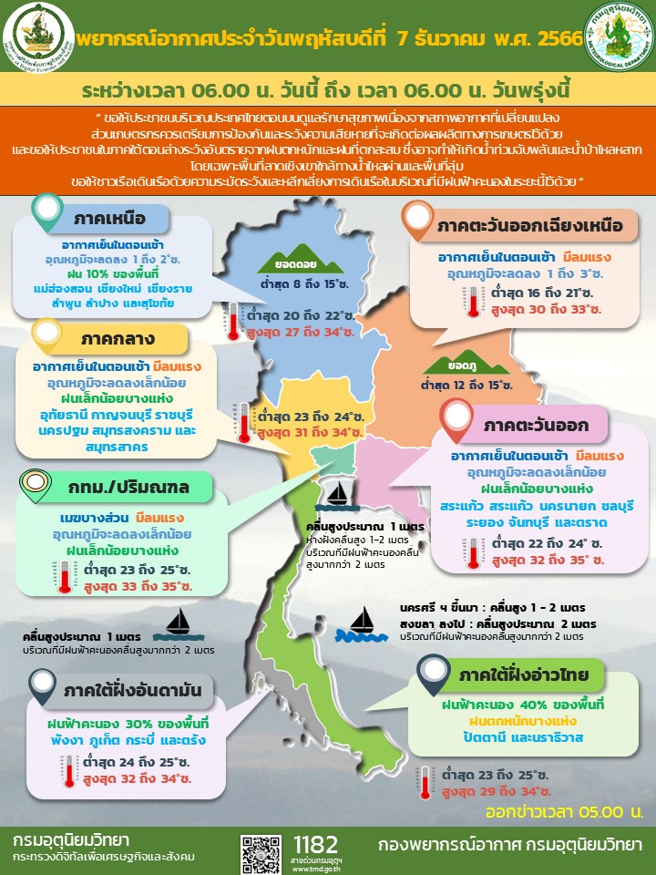 กรุงเทพฯ 7 ธ.ค. – อุตุฯ เผยไทยตอนบนอุณหภูมิลดลงกับมีลมแรง ภาคเหนือ-อีสาน อากาศเย็นตอนเช้า อุณหภูมิจะลดลง 1–3 องศาฯ ส่วนภาคกลาง รวมทั้งกรุงเทพฯ – ปริมณฑล และภาคตะวันออก อุณหภูมิจะลดลงเล็กน้อย