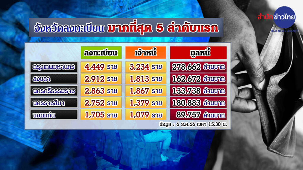 กรุงเทพฯ 7 ธ.ค. – ตัวเลขการลงทะเบียนหนี้นอกระบบรวม 6 วัน ยอดหนี้พุ่งกว่า 3,000 ล้านบาท ลูกหนี้เกือบ 70,000 ราย กทม. ลงทะเบียนมากที่สุด สงขลา รองลงมา