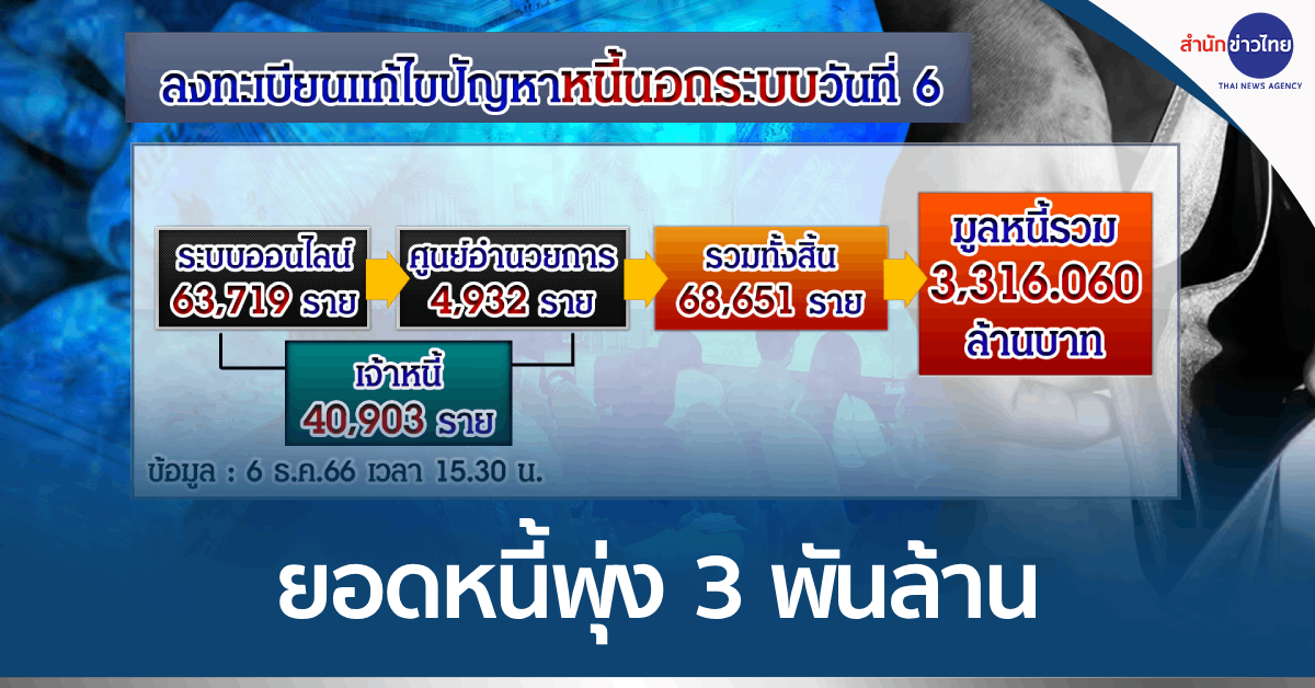 รัฐบาลเปิดรับลงทะเบียนแก้ไขปัญหาหนี้นอกระบบ มาตั้งแต่วันที่ 1 ธันวาคมที่ผ่านมา มีลูกหนี้ทยอยมาลงทะเบียนต่อเนื่อง โดยกระทรวงมหาดไทย ได้เปิดเผยตัวเลขการลงเทียนตั้งแต่วันแรก ถึงเมื่อวานนี้ (6 ธ.ค.66) เวลา 15.30 น. พบว่ามีประชาชนลงทะเบียนรวมทั้งสิ้น จำนวน 68,651 ราย แบ่งเป็นการลงทะเบียนผ่านระบบออนไลน์ 63,719 ราย และการลงทะเบียน ณ ศูนย์อำนวยการแก้ไขหนี้นอกระบบ 4,932 ราย รวมจำนวนเจ้าหนี้ 40,903 ราย มีมูลหนี้รวม 3,316 ล้านบาท