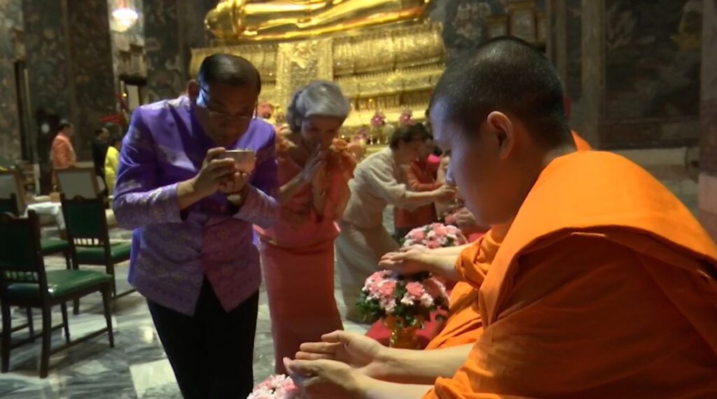 ภายหลังพิธีสรงน้ำพระพุทธรูปและพระสงฆ์ ในพระวิหารวัดสุทัศนเทพวราราม ในงานฉลองสงกรานต์ มรดกภูมิปัญญาทางวัฒนธรรมของมนุษยชาติ