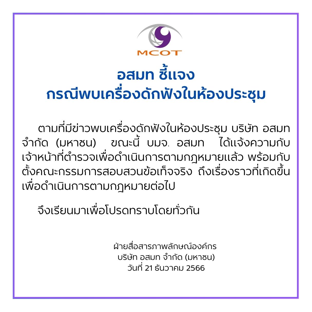 อสมท 21 ธ.ค. – ตามที่มีข่าวพบเครื่องดักฟังในห้องประชุม บริษัท อสมท จำกัด (มหาชน) ขณะนี้ บมจ.อสมท ได้แจ้งความกับเจ้าหน้าที่ตำรวจเพื่อดำเนินการตามกฎหมายแล้ว พร้อมกับตั้งคณะกรรมการสอบสวนข้อเท็จจริง ถึงเรื่องราวที่เกิดขึ้น เพื่อดำเนินการตามกฎหมายต่อไป