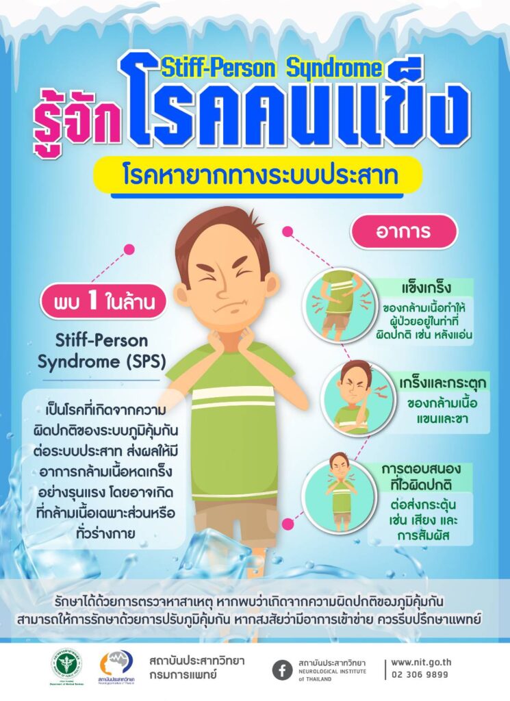 นายแพทย์ธนินทร์ เวชชาภินันท์ ผู้อำนวยการสถาบันประสาทวิทยา กล่าวเพิ่มเติมว่า เซลล์ประสาทที่ได้รับผลกระทบอยู่ที่เซลล์ประสาทสั่งการ (motor neuron) บริเวณไขสันหลัง เมื่อมีการทำงานมากเกินไปจะทำให้เกิดอาการเจ็บปวดกล้ามเนื้อ กล้ามเนื้อเกร็ง และกระตุกโดยเฉพาะที่หลังและต้นขา ผู้ป่วยอาการนี้จะไวต่อการรับรู้สิ่งเร้า เช่น มีอาการสะดุ้งหรือร่างกายกระตุกอย่างแรงเมื่อได้ยินเสียงดัง หากปล่อยให้โรคดำเนินมากขึ้น กล้ามเนื้อบริเวณนั้นจะถูกดึงรั้งจนหลังผิดรูปได้ นอกจากนี้ยังพบการทำงานผิดปกติของระบบภูมิคุ้มกันต่อเซลล์อื่นของร่างกายได้ เช่น ที่ตับอ่อน ไทรอยด์อักเสบ ภาวะซีด เกิดโรคด่างขาวที่ผิวหนัง เป็นต้น เมื่อถูกวินิจฉัยเป็นโรคนี้แล้ว จำเป็นที่จะต้องตรวจหาโรคอื่น ๆ เช่น เนื้องอก อาจจะเป็นมะเร็งและสามารถกระตุ้นทำให้เกิดภูมิคุ้มกันแปรปรวนส่งผลให้เกิดอาการต่าง ๆ แพทย์วินิจฉัยโดยการเจาะเลือดหรือน้ำไขสันหลัง และการตรวจคลื่นไฟฟ้ากล้ามเนื้อ (EMG) เพื่อช่วยยืนยันโรค การรักษาได้แก่ การปรับภูมิคุ้มกันที่มากเกินไป และแพทย์จะรักษาตามอาการที่แสดงออกมา เช่น ลดอาการเกร็งและกระตุกของกล้ามเนื้อด้วยยาในกลุ่ม เบนโซไดอะซีปีน (Benzodiazepines) หรือ บาโคลเฟน (Baclofen) เมื่อเป็นแล้วก็ควรรีบเข้ารับการรักษา โดยทั้งหมดขึ้นอยู่กับการวินิจฉัยโดยแพทย์. -411-สำนักข่าวไทย