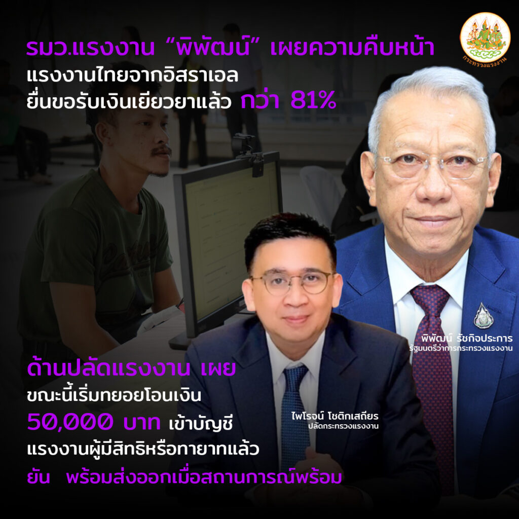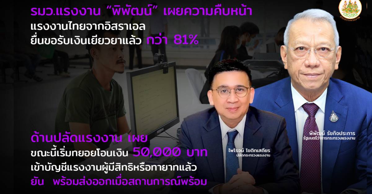 นายพิพัฒน์ รัชกิจประการ รัฐมนตรีว่าการกระทรวงแรงงาน เปิดเผยถึงความคืบหน้าการให้ความช่วยเหลือแรงงานไทยที่กลับจากอิสราเอลที่มายื่นคำร้องเพื่อขอรับเงินเยียวยาแรงงานไทยจากสถานการณ์ความไม่สงบในอิสราเอล รายละ 50,000 บาทว่า ขณะนี้มีผู้มายื่นคำร้องแล้วจำนวน 8,032 ราย จากจำนวนทั้งหมด 9,697 คน คิดเป็น 81.04 % แยกเป็น กรณีมายื่นด้วยตนเอง 7,983 ราย กรณีเสียชีวิต 22 ราย กรณี Re-Entry 27 ราย โดยเอกสารที่ยื่นอยู่ระหว่างการตรวจสอบและพิจารณาเอกสาร จำนวน 3,601 ราย ผ่านการพิจารณาจากคณะทำงาน กระทรวง/จังหวัด แล้ว จำนวน 4,192 ราย หน่วยงานตรวจสอบและขออนุมัติการจ่ายเงินแล้ว 193 ราย โดยขณะนี้ได้เริ่มทยอยโอนเงินเข้าบัญชีให้ผู้มีสิทธิหรือทายาทของแรงงานแล้ว