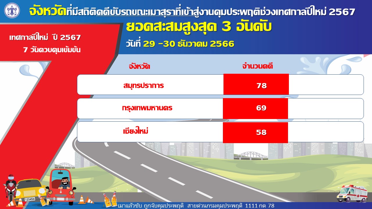 จังหวัดที่มีสถิติคดีขับรถขณะเมาสุราสะสมสูงสุด 3 อันดับ ได้แก่ สมุทรปราการ เป็นอันดับหนึ่ง 78 คดี รองลงมา กรุงเทพมหานคร 69 คดี และ เชียงใหม่ 58 คดี เมื่อเปรียบเทียบสถิติคดีที่เข้าสู่งานคุมประพฤติ พบว่า คดีขับรถในขณะเมาสุรา ปีที่แล้ว 30 ธันวาคม พ.ศ. 2565 จำนวน 1,433 คดี และปีนี้ 30 ธันวาคม พ.ศ. 2566 จำนวน 102 คดี ลดลง จำนวน 1,331 คดี คิดเป็นร้อยละ 92.88